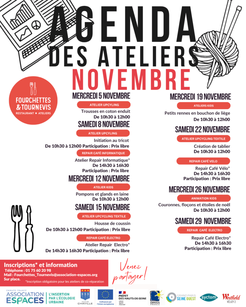 Ateliers créatifs et « repair » à Fourchettes & Tournevis le 27 octobre 202527 octobre 2025 par Marylene En novembre, l’équipe en insertion de Fourchettes & Tournevis propose ses ateliers créatifs, des jeux de société, et poursuit son offre d’ateliers de co-réparation avec un atelier couture, un atelier électro et un atelier 2-roues. Rendez-vous dans le tiers-lieu de la galerie marchande des Créneaux, à Chaville, pour participer à des ateliers les mercredi et samedi ! 1119 Avenue Roger Salengro, Chaville Fourchettes & Tournevis complète l’action de La P’tite Boutique et collecte du matériel électrique ou informatique, ainsi que des lampes ou des objets de déco. La P’tite Boutique vous donne également rendez-vous en novembre pour La braderie solidaire à l’Atrium de Chaville : le samedi 8 novembre de 10h à 17h. avec La Croix Rouge, Le Secours Populaire et La Croix Bleue des Arméniens de France.