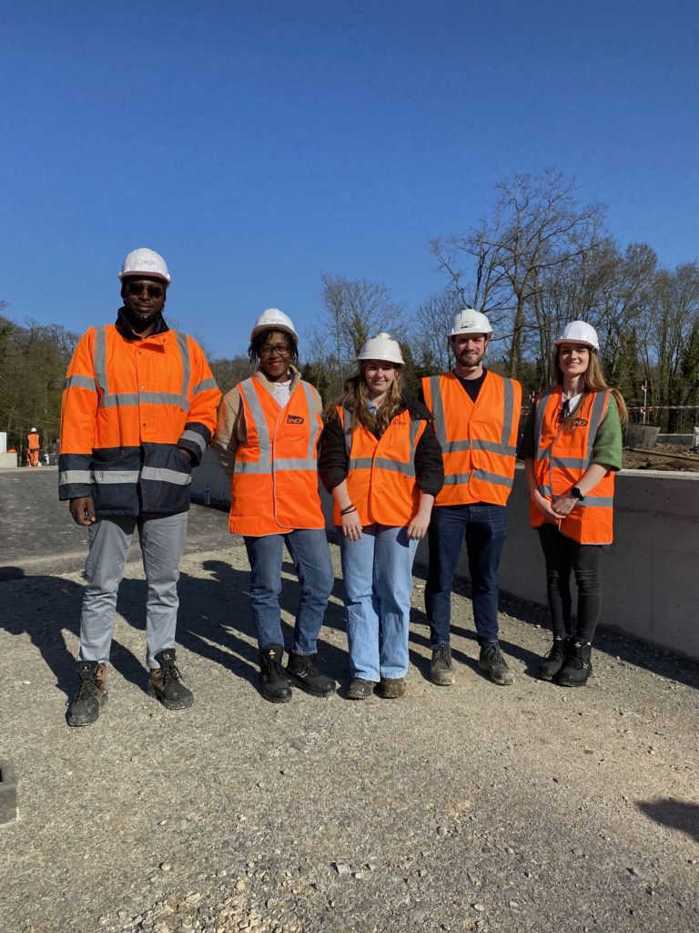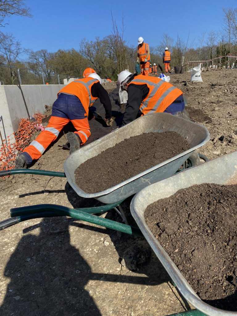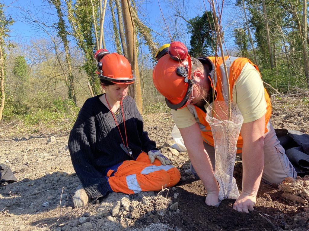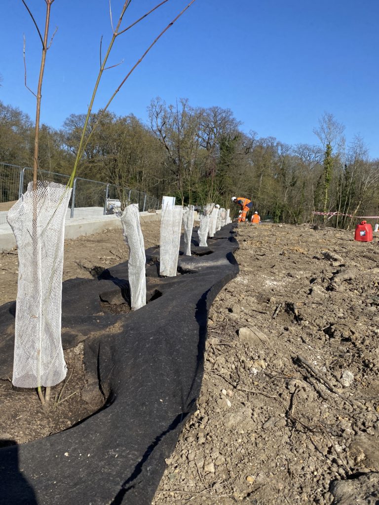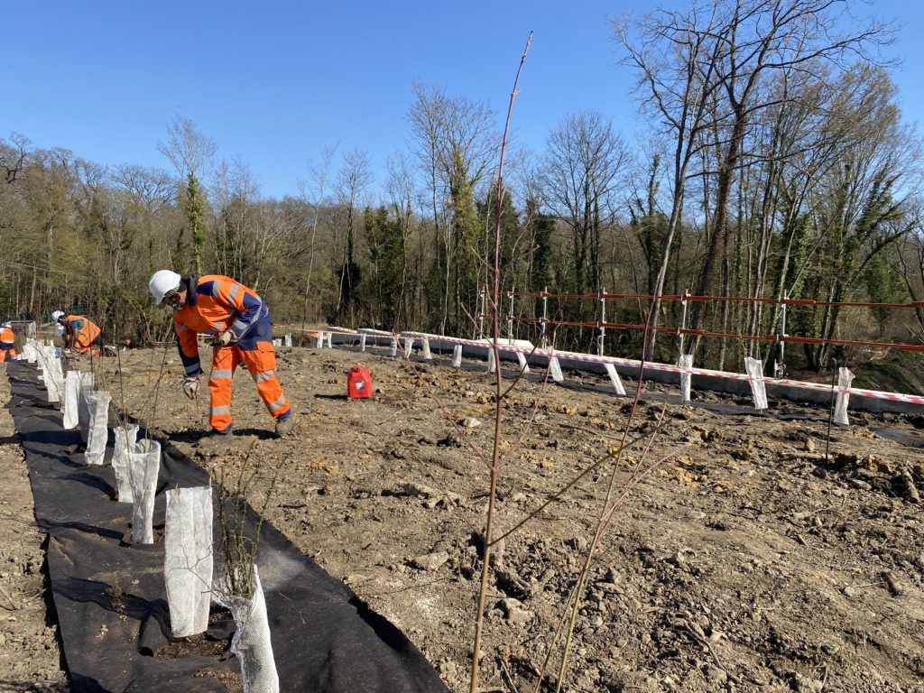 Créer des passages pour la faune sur le tracé du Tramway le 5 mars 20265 mars 2026 par Marylene Sur le tracé du nouveau tram 13, les équipes d’Espaces sont intervenues à la demande de la SNCF Réseau pour réaliser une plantation d’arbres, des installations pour la faune et une prairie fleurie. 166 arbustes sont plantés sur un passage au dessus des voies d’environ 200 mètres. Plantés en ce mois de mars, les arbustes d’essences variées sont amenés à mesurer à terme 2 ou 3 mètres de haut maximum. Ce sont deux équipes soit 22 salarié·es qui interviennent pour la plantation. Les salarié·es des équipes des talus ferroviaires aval et de Gares Ferroviaire Yvelines ont ainsi collaboré. Comment assurer le passage de la faune dans le cadre de la mise en place du tramway en forêt de Saint-Germain ? Plantation d’arbre avec apport de substrat spécifique, création d’andains (des tas de bois et pierres comme refuges pour les animaux) et d’hibernaculum… entourés d’une prairie fleurie d’espèces locales : cette zone créée par les équipes d’Espaces permettra le passage de la faune, tel un couloir de biodiversité recréé au dessus des voies du tramway 13. Un piège à traces sera également installé pour pouvoir observer le passage des animaux. Dans la fourmilière de ce travail de plantations, nous avons recueilli 4 points de vue sur le chantier en cours : Notre partenaire commanditaire est le maître d’ouvrage SNCF réseau. Vanessa Verger, chargée de projet achats responsables nous en dit plus sur la volonté du groupe de faire appel à des équipes en insertion et leur expertise. « Nous avons un objectif d’achats inclusifs et responsables, on source donc des entreprises inclusives, des ESAT… mais il est difficile d’avoir des réponses à nos marchés. On cherche à comprendre comment travailler plus souvent avec des entreprises inclusives. C’était important pour nous de faire appel à une SIAE (structure d’insertion par l’activité économique) car l’équipe projet voulait vraiment un partenaire inclusif – le marché était initialement réservé à un ESAT et la consultation s’est avérée infructueuse. SNCF est très engagée à travers la clause d’insertion : 800 000 heures ont été réalisées en insertion en 2025 sur l’ensemble de nos marchés. 12 millions d’euros d’achat sont faits en direct avec des structures d’insertion et ESAT. L’objectif 2050 est d’investir 50 millions d’euros. On travaille donc dès aujourd’hui en interne avec les prescripteurs pour leur donner confiance en l’insertion. » Alexis Tréboit, encadrant de l’équipe en insertion « GFY » Espaces « On est là pour aider nos collègues, en renfort. C’est une plantation assez spécifique avec des demandes précises du partenaire. Pour les salarié·es qui n’ont jamais fait de plantations c’est l’occasion d’apprendre, ou de se perfectionner. Ça permet aussi aux équipes de se rencontrer. Noureddine El Mouden, encadrant de l’équipe en insertion « TFAVAL » Espaces « C’est la première fois qu’on fait ça : plantation d’arbres, andain et hibernaculum, on le fait avec l’aide des chargés de mission écologie d’Espaces. C’est bien qu’ils aient le souci de l’écologie sur ce site, on y fait de belles choses et on espère réaliser d’autres chantiers avec ces partenaires. Ce serait bien de revenir pour l’entretien du site. Voir le résultat de notre travail et le préserver. » Alexis Rizat, chargé de mission écologie urbaine Espaces « Pour nous c’est vraiment intéressant : c’est un autre type de chantier qui nous a permis de travailler avec des entreprises différentes, sur des secteurs différents. La méthodologie est également différente, avec des contraintes environnementales à respecter bien sûr. On est suivi par la stratégie environnement nationale. Le sujet est intéressant et très formateur ; ça a permis de former de nombreux·ses salarié·es à de nouveaux gestes et techniques de plantation d’arbres et de création d’aménagements. » De gauche à droite sur la photoLilian TCHIPSSE (EGIS GROUPE) ; Vanessa VERGER (SNCF RESEAU / SIEGE SNCF RESEAU / DGFA DA ACHATS RESPONSABLES) ; Margot MARTINS (EXT ATIF) ; Antoine LEBLANC (ESPACES) ; Ornella NINCI (SNCF RESEAU / SIEGE SNCF RESEAU / DGFA DA ACHATS RESPONSABLES)